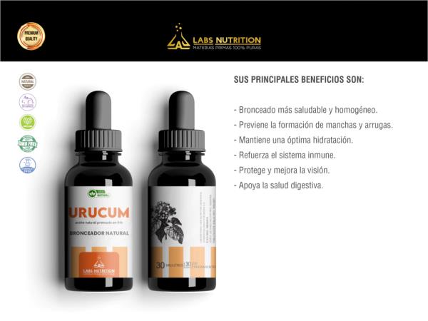 El Urucum es una semilla tropical que cuenta con concentraciones mucho más elevadas de beta-caroteno que la zanahoria. Acelera el bronceado de manera saludable, pareja y sin manchas. Tiene propiedades antioxidantes, ayuda en la producción de colágeno e hidrata la piel. Puede utilizarse como post solar para prolongar el bronceado.